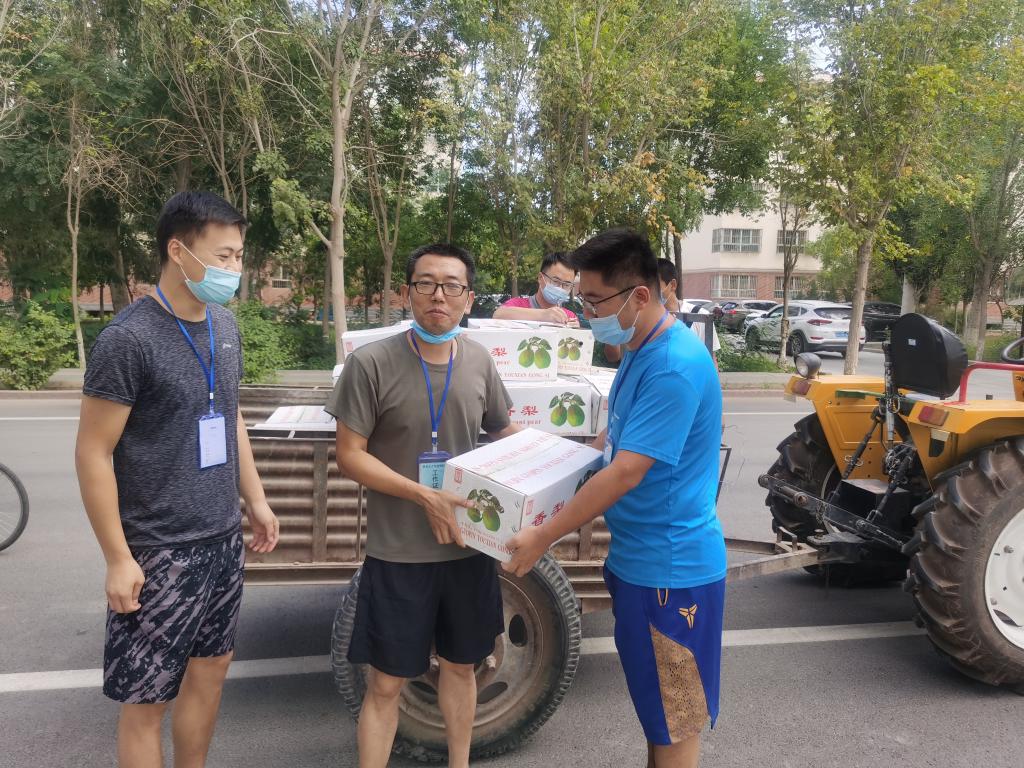 8月15日中午,十二团果业协会会长刘世帆、副会长吕百全一行带着76箱香梨,看望慰问公司抗疫一线人员。公司党委副书记胡松林,副经理张宏以及公司部分教工在公司正南门参加了此次捐赠活动。
