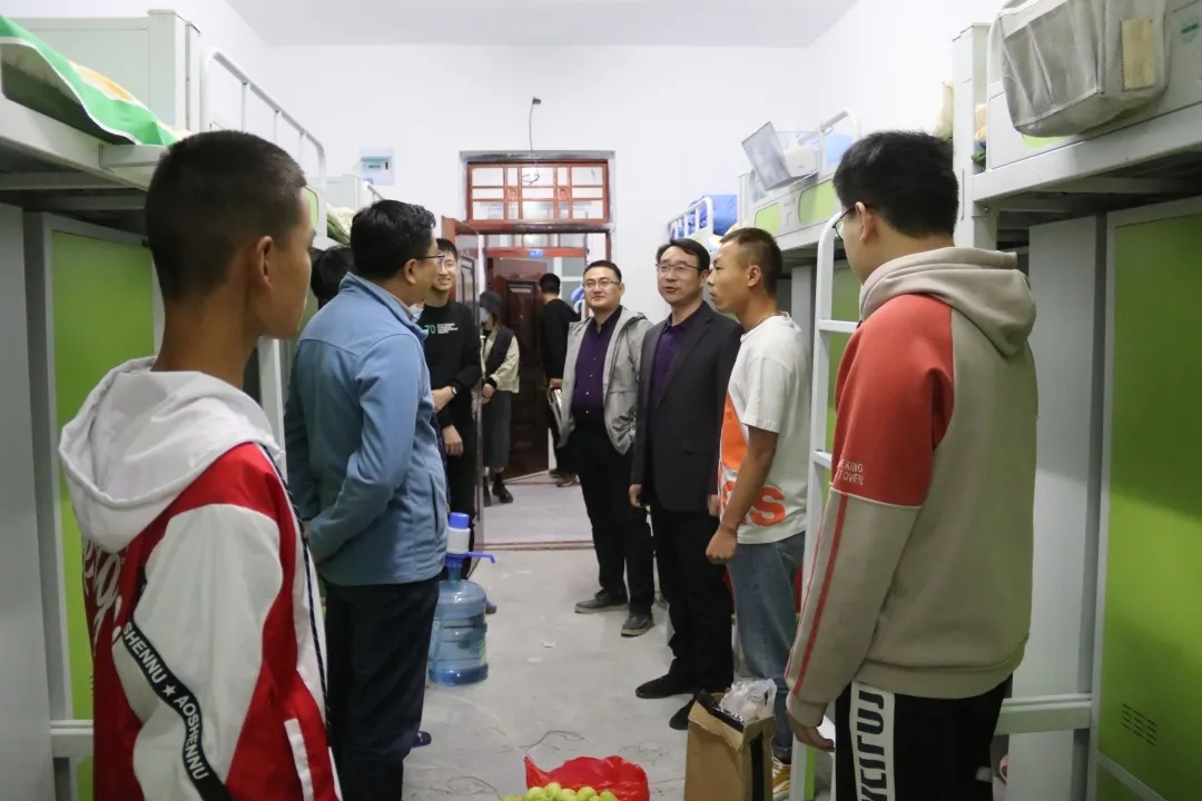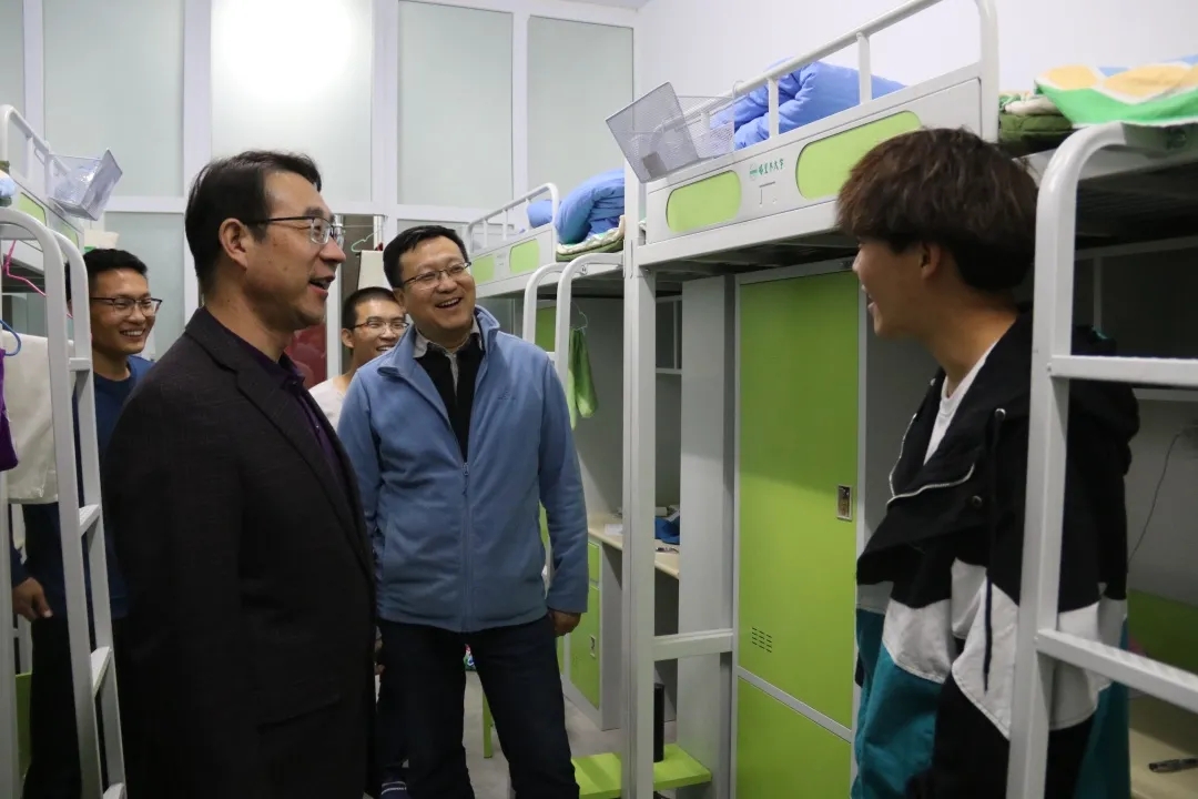王旭峰一行先后来到西区13号、1号员工公寓楼看望2020级新生。每到一处,王旭峰、张宏都与新生亲切的交流,详细的了解新生来自哪里、是否适应新的环境,同时检查宿舍设施是否完备、齐全;同时,王旭峰还提醒大家要注意宿舍卫生,保证宿舍干净整洁。