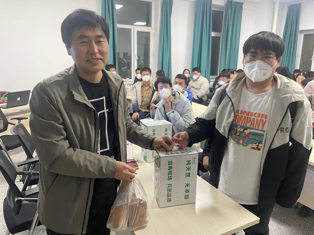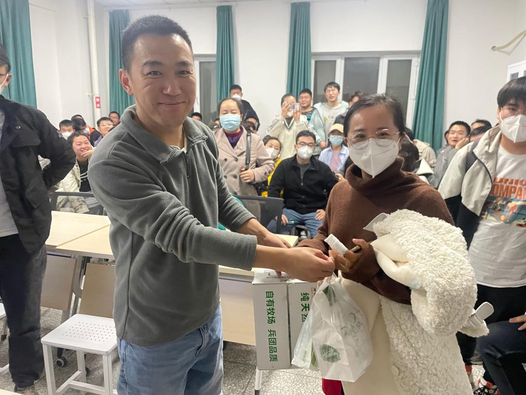 张辉结合自身经历从怎么看待科研、为什么做科研、如何做好人生规划三个方面为全体研究生进行分享,并给大家分发了慰问品。