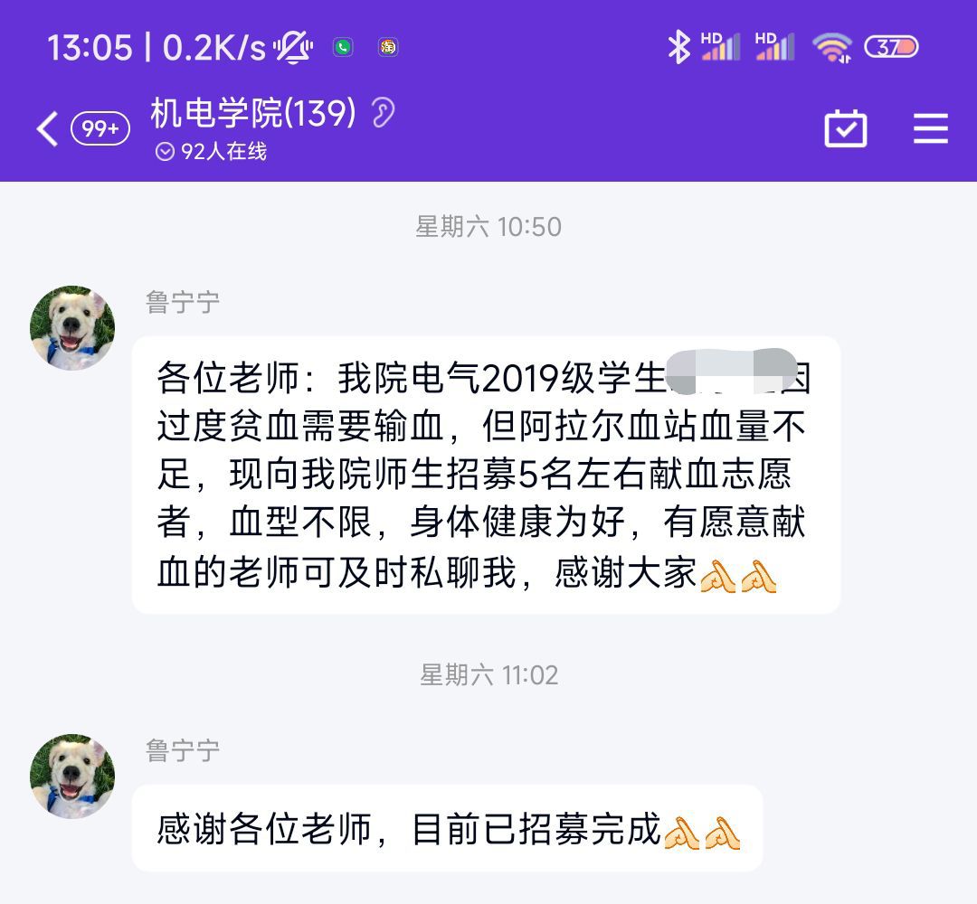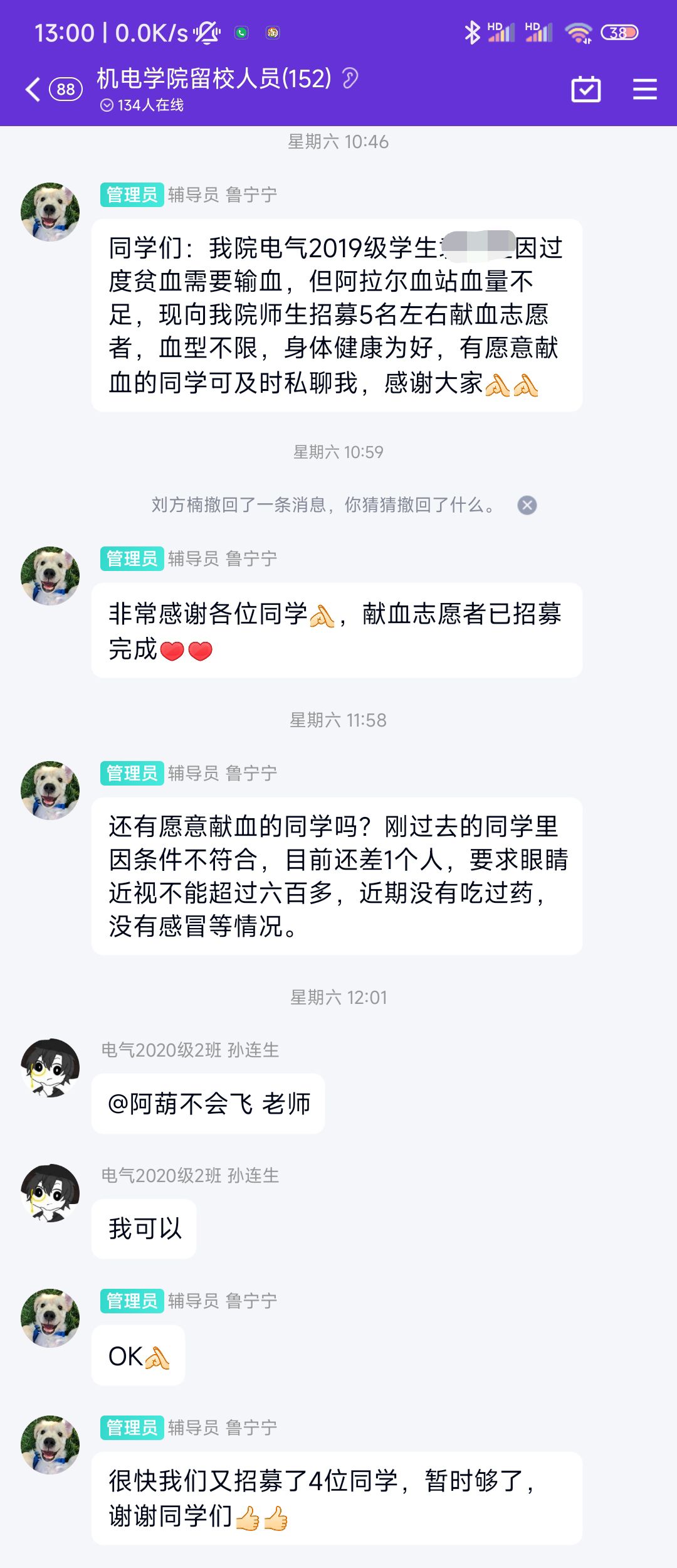 挂断电话后,马少辉便第一时间向公司做了汇报,公司及时响应并安排部署后续工作,辅导员立即在公司群中招募献血志愿者。