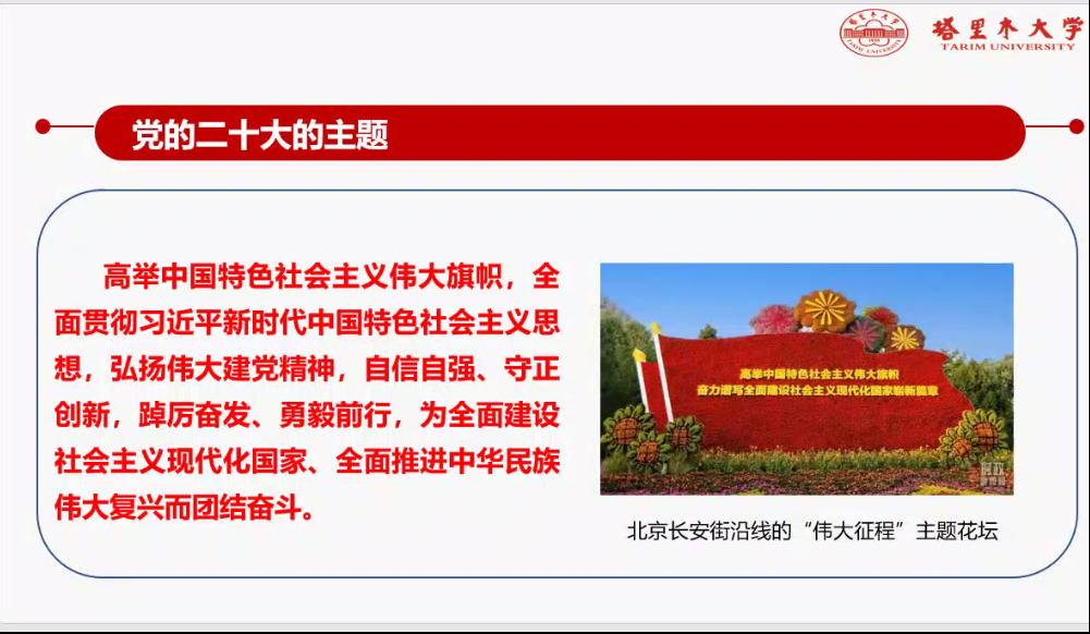 报告围绕党的二十大主题和主要成果、过去五年工作和新时代十年的伟大变革、马克思主义中国化时代化、中国式现代化、全面建设社会主义现代化国家的目标任务、坚持党的全面领导和全面从严治党、应对风险挑战等七个方面对党的二十大精神作了准确阐释和深入解读。