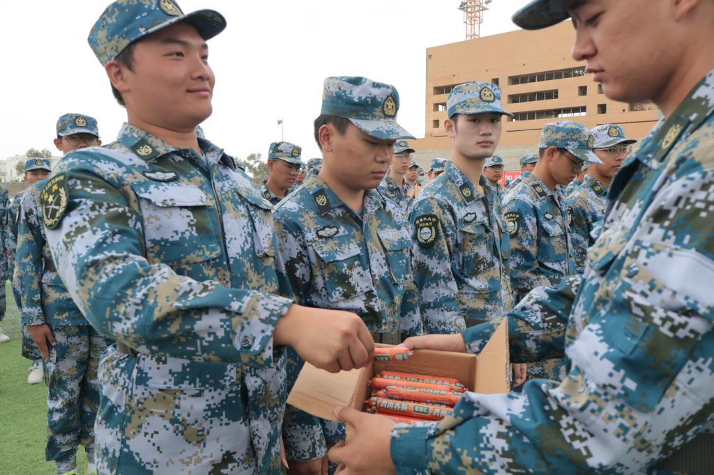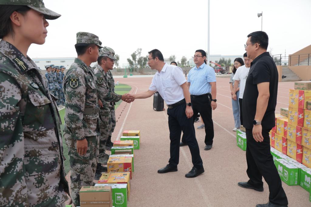 一声声口号在训练场上回响,展现了机电学子蓬勃向上的精神面貌。王旭峰代表公司全体师生向承训教官及指导员的工作表示感谢,向全体参训的同学们表示亲切的问候,并对同学们高昂的军训热情和端正的训练态度表示高度的肯定和赞扬。他表示,军训既是大学教育的必修课,同时也是磨砺意志、增强体魄的关键一课。随后,公司党委书记王旭峰代表公司为承训教官和参训员工分发了牛奶等慰问品,给大家带来公司的问候与温暖。