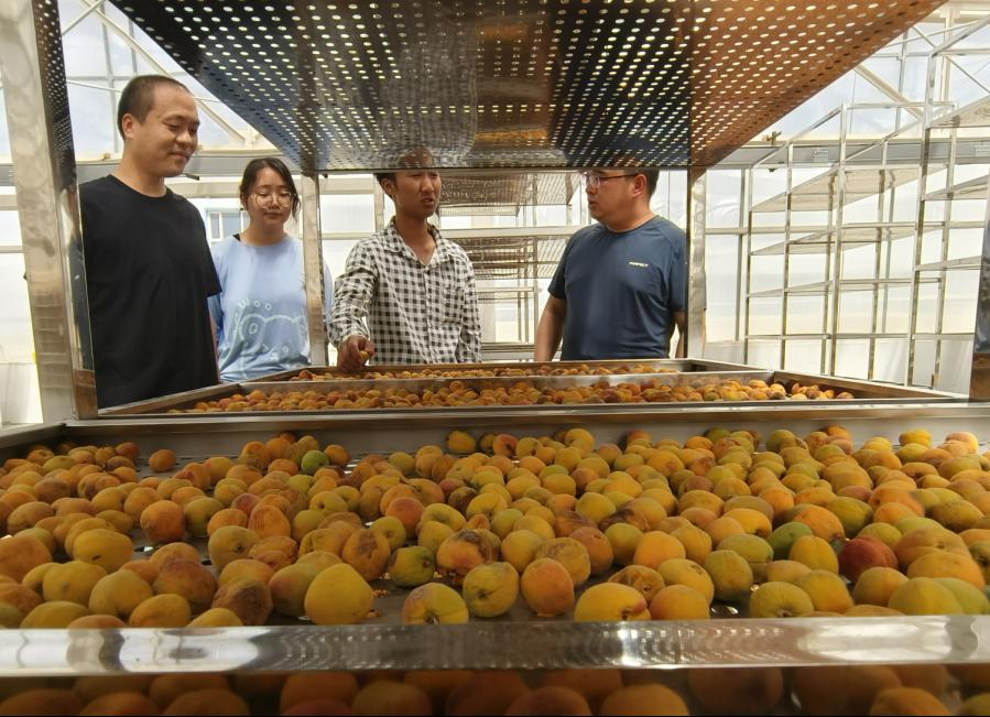 在吊干杏种植基地,团队成员现场查看了吊干杏长势和挂果情况,就吊干杏如何预防冰雹等灾害给予了指导,并与农户就吊干杏产业如何更好地提质增效进行了广泛交流指导,从品种选育、栽培管理到脱毒和晾晒、清洗、烘干、包装等环节多方面要加强技术控制,确保吊干杏品质优良,助力农户增收。