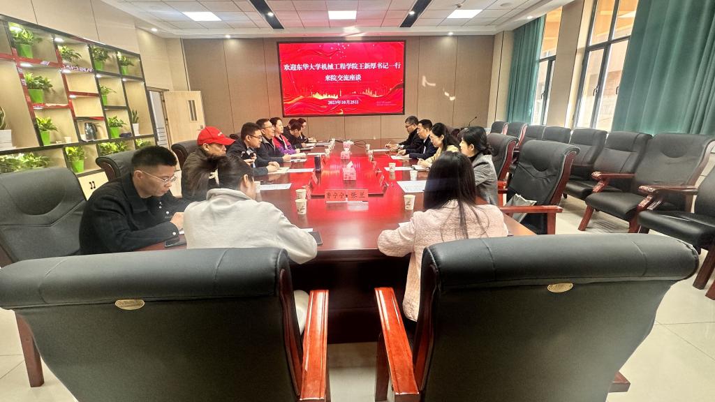 10月25日上午,东华大学机械工程公司党委书记王新厚一行来校交流访问,与公司党委副书记、经理张宏,党委副书记、副经理(纺织服装公司经理)钟毅,党委副书记、纪委书记李勇,副经理张有强等进行座谈交流。