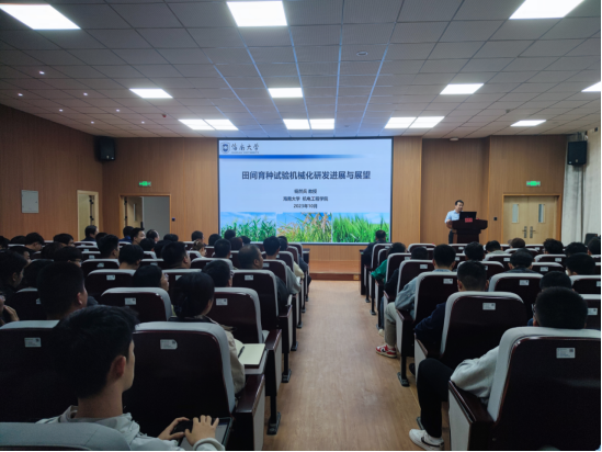 10月12日下午,海南大学二级教授杨然兵为公司师生作了题为《田间育种试验机械化研发进展与展望》的专题讲座。机电院师生代表100多人听取了讲座。讲座由公司经理张宏主持,在公司D109会议室举行。