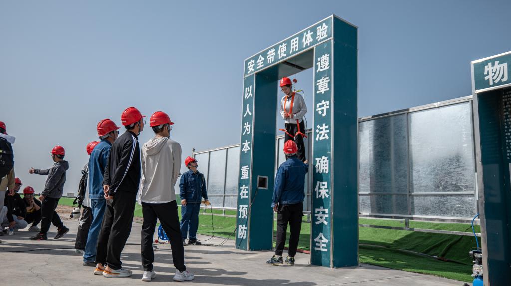 在“电网体验师”活动现场,同学们深入750千伏阿拉尔变电站新建工程现场,了解了电网建设的基本环节及安全质量管理等措施。在专业人员的指导下,进行安全带穿戴、高空坠物、安全急救和消防灭火等设备操作体验。