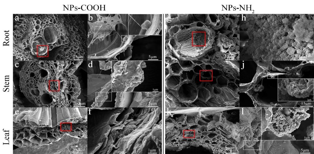 论文首次证明了带差异电荷的微/纳米塑料更易被空心菜根系吸收,质外体途径是其主要转运路径。并且,空心菜吸收较大粒径微塑料主要是由于其根部受损导致了氧化应激水平增高。空心菜体内积累量最多的为NPs-COOH(平均浓度1640.16 mg L-1),积累量最少的为NPs-NH2(平均浓度253.7 mg L-1)。在Zeta电位为-54.14-33.66 mV,粒径为17.42-1454.93 nm的区间内,N/MPs从根向茎易位的主要影响因素为粒径,而从水培溶液进入根和从茎向叶易位的主要影响因素均为Zeta电位,表明除粒径外,表面电荷是微/纳米塑料在空心菜体内吸收和转运的主要影响因素。不同电性的微/纳米塑料均引起空心菜根部的渗透胁迫。叶片内少量的微/纳米塑料可以显著刺激叶绿素的产生(P>0.05),而过量N/MPs会导致叶绿素含量显著下降(P<0.05)。研究结果表明微/纳米塑料的表面电荷通过改变根部氧化应激水平从而有效影响了空心菜对微/纳米塑料的吸收和转运过程。