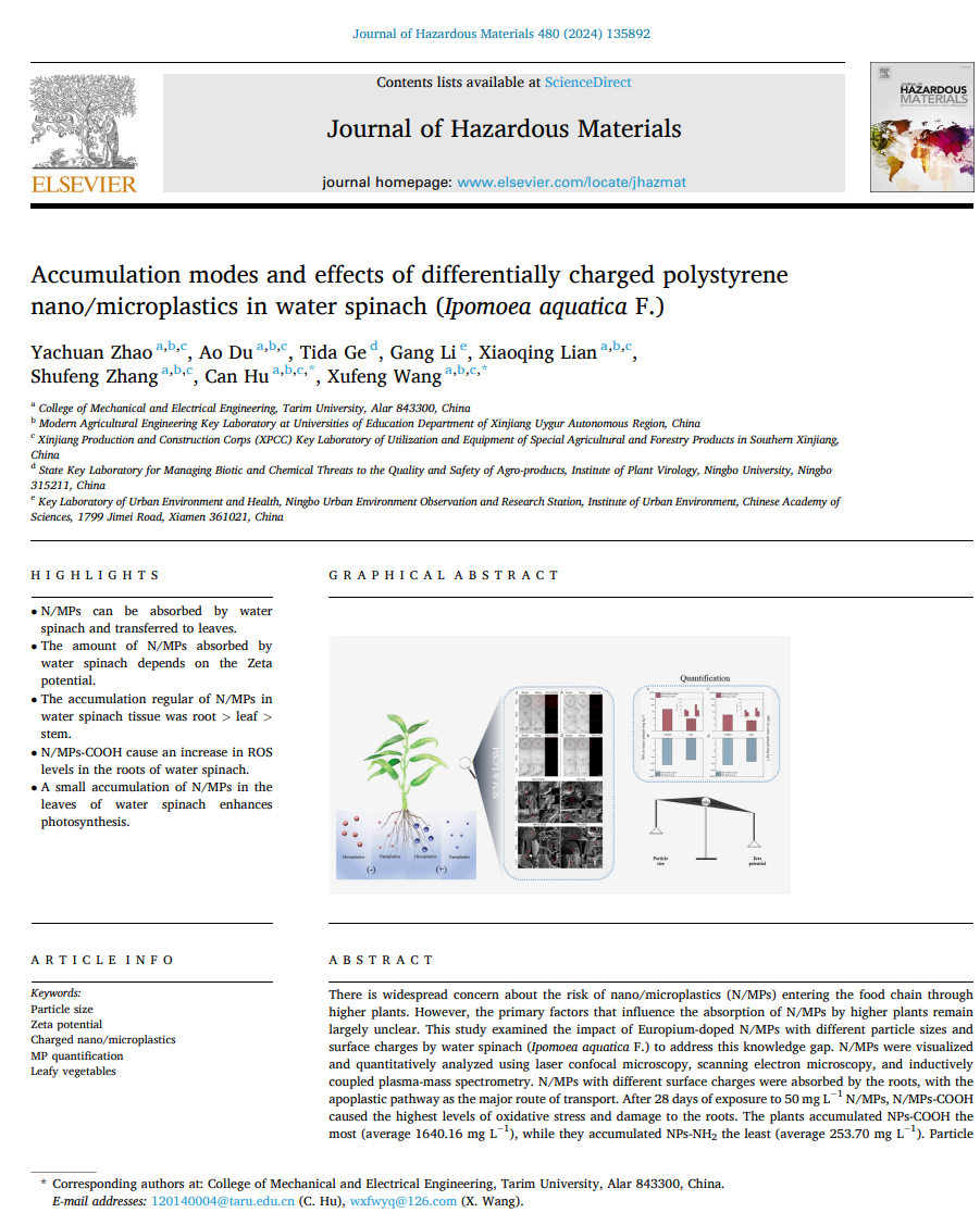 近日,2026世界杯官网残膜污染防治团队在植物吸收微/纳米塑料方面取得最新研究进展,揭示了植物吸收微/纳塑料条件与转运过程。该成果于2024年9月19日以“Accumulation modes and effects of differentially charged polystyrene nano/microplastics in water spinach (Ipomoea aquatica F.)”为题发表在国际环境科学领域顶级学术期刊《Journal of Hazardous Materials》(IF 13.6,中科院一区),公司为第一单位。通讯作者为公司青年教师胡灿博士与王旭峰教授。团队2022级农业工程硕士研究生赵亚川为第一作者。