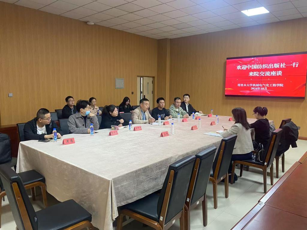 10月14日,中国纺织出版社总编辑孔会云、纺织与轻化图书分社副社长范雨昕、服装图书分社副社长宗静和图书营销中心主任助理裘康一行4人来院与公司纺织工程、服装与服饰设计专业教师在新校区一期机电楼D102会议室座谈交流,会议由纺织服装公司副经理卢雨正主持。
