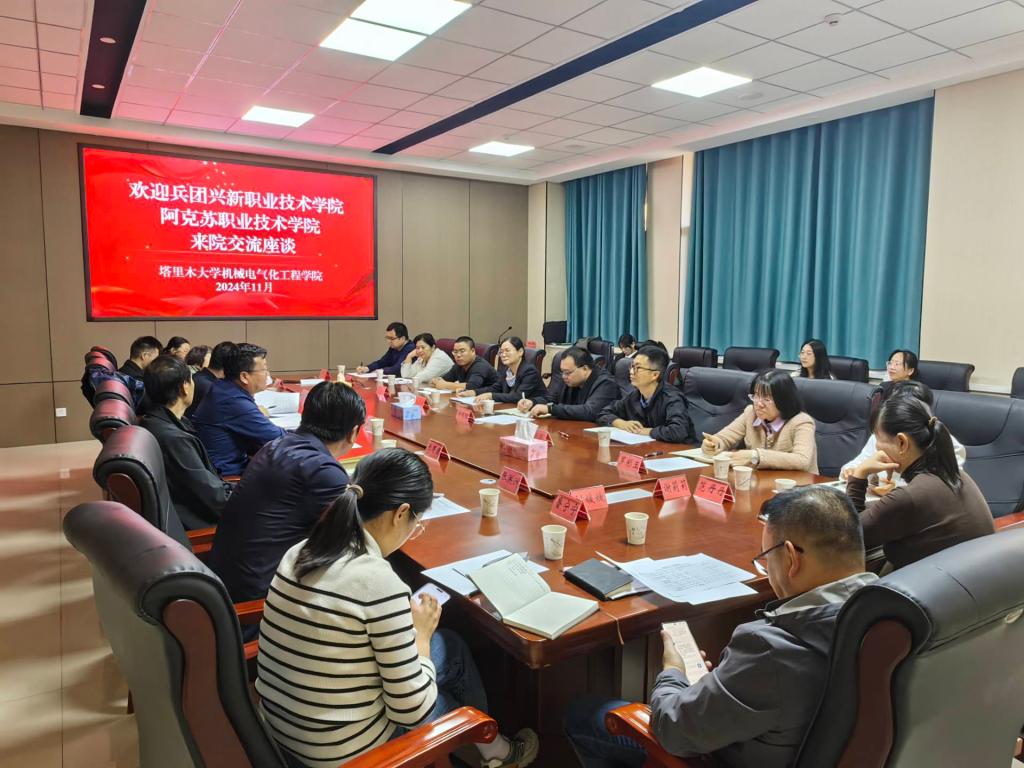 11月7日,兵团兴新职业技术公司机电工程公司副经理郑明理,阿克苏职业技术公司本科教学部党总支书记叶岗带领相关公司教师来院调研交流,与公司党委副书记、经理张宏,教务处副处长朱天生,副经理张有强等领导,在新校区一期机电楼D323会议室进行座谈。