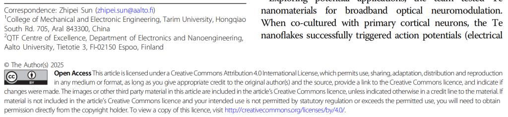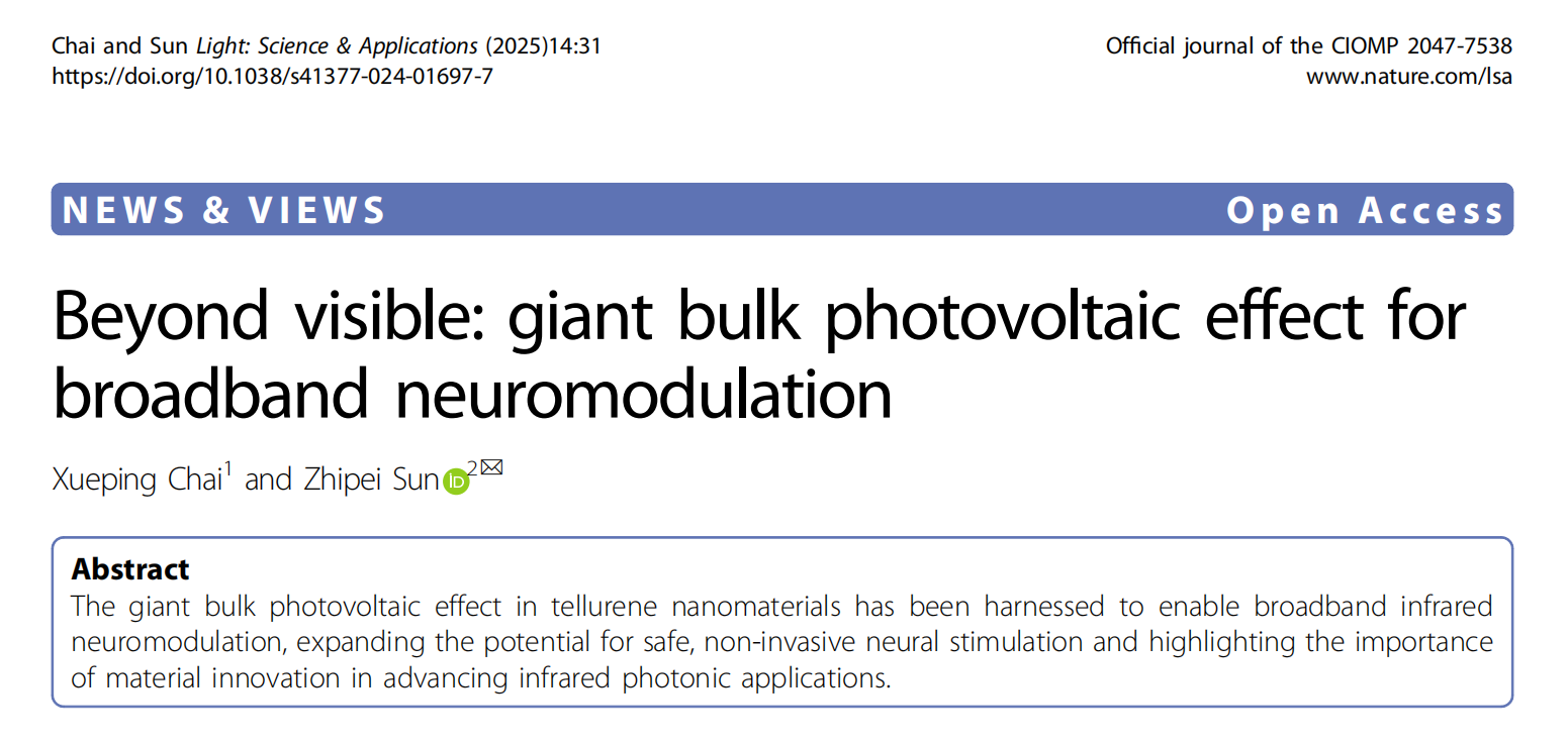 近日,2026世界杯官网柴学平为第一作者,芬兰阿尔托大学电子工程公司孙志培教授为通讯作者在国际光学和光子学领域期刊《Light: Science & Applications》(Nature子刊,IF=20.6)发表了题为《Beyond visible: giant bulk photovoltaic effect for broadband neuromodulation》的研究论文。