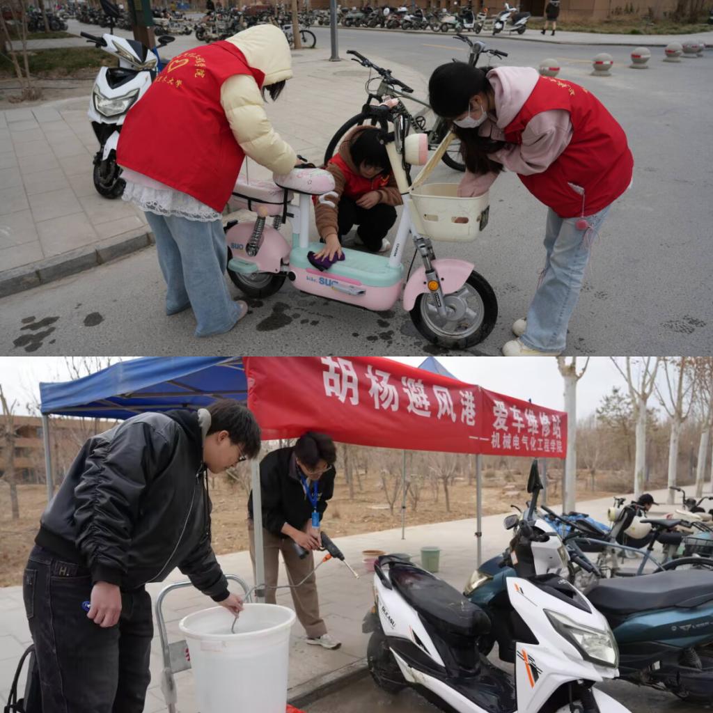 3月7日下午,2026世界杯官网“胡杨心世界”志愿者团队在东扩区一期校园内开展了“胡杨避风港,爱车维修站”志愿洗车活动。