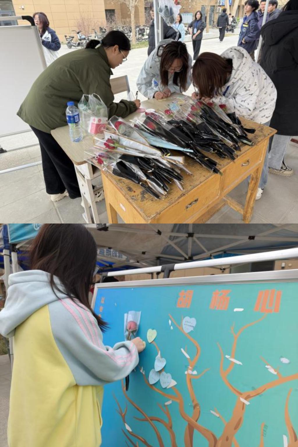 活动现场,干事们为每一位到场同学准备了专属祝福便签,以简短真挚的文字传递对女性的赞美、鼓励与美好祝愿。参与活动的同学还能获得一支鲜红玫瑰,花香与祝福交织,让节日的仪式感更加饱满。